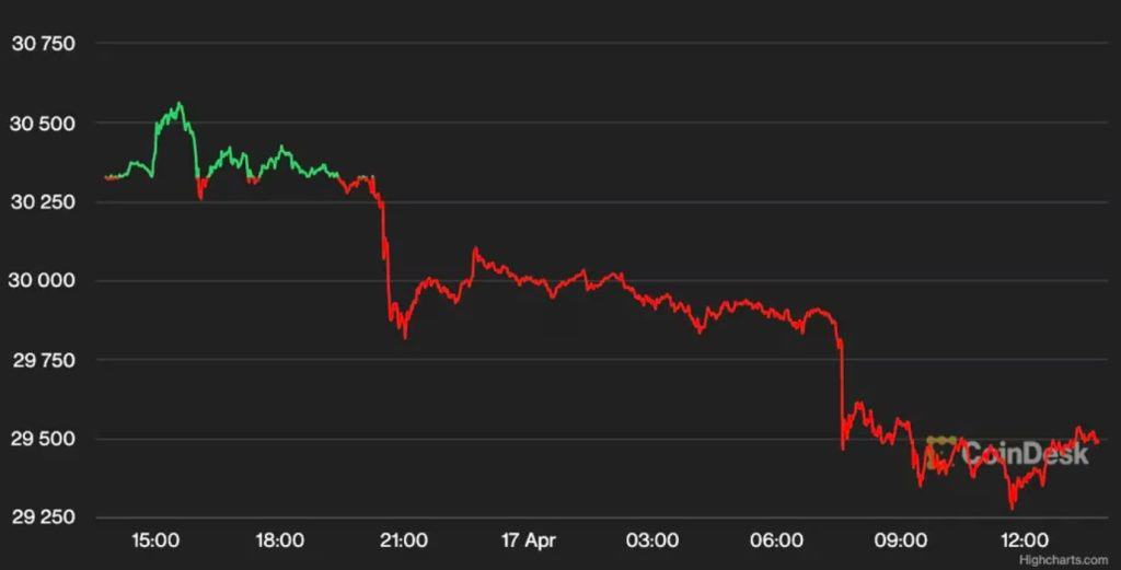 The largest cryptocurrency by market capitalization was recently trading at around $29,500, off 2.6% over the past 24 hours. Bitcoin began sinking on Sunday and dropped as low as $29,292 before rebounding slightly, according to CoinDesk data.